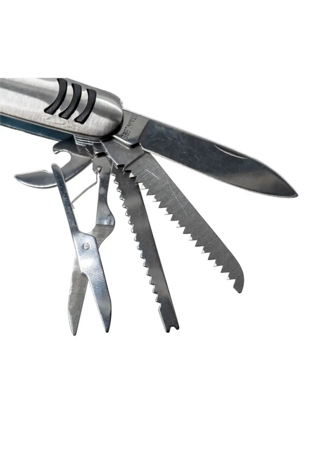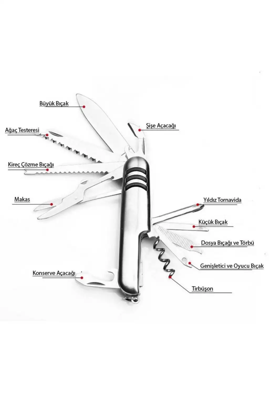 1- Büyük Bıçak 2- Şişe Açacağı 3- Yıldız Tornavida 4- Küçük BIçak 5- Dosya bıçağı ve törbü 6- Genişletici ve oyucu bıçak 7- Tirbüşon 8- Ağaç testeresi 9- Kireç çözme bıçağı 10- Makas 11- Konserve açacağı Ürün Değişimi Ve İade Koşulları: Ürünü kargodan teslim alınırken paketler mutlaka kontrol edilmeli, hasarlı paket veya ürünler teslim alınmamalı, imza atılmamalı ve kargo yetkilisine hasar tespit tutanağı tutturmanız gerekmektedir. Kuryelerin ürüne baktırmak istememeleri durumunda ürünü hiç teslim almadan iade ediniz. Kontrol etmeksizin imzalayıp teslim aldığınız ürünlerde kargo veya gönderici firma sorumluluk kabul etmemektedir. Sadece Hasar tespiti yapılan ürünlerin ücretsiz değişimi veya iadesi yapılabilmektedir.