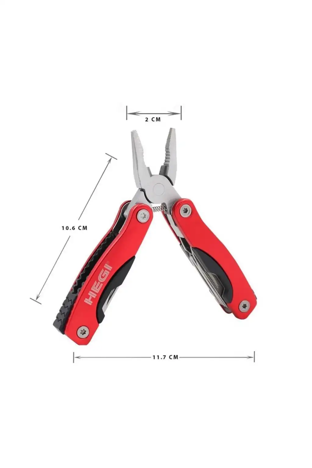 Hegi 818100031 Çok Fonksiyonlu Paslanmaz Çelik Mini Pense - Kırmızı Hepsi ir arada çok işlevli pense, Malzeme: Paslanmaz Çelik Renk: Kırmızı Ağırlık: 90 gr Ölçüler Açık : 10.6cm x 6cm Kapalı : 7cm x 3.5cm Fonksiyonlar Pense Bıçak Testere Yıldız tornavida Düz tornavida Şişe açacağı Törpü Manivela Teslimat İçeriği 1 Adet - Çok fonksiyonlu pense 1 Adet - Kemere takılabilir kılıf
