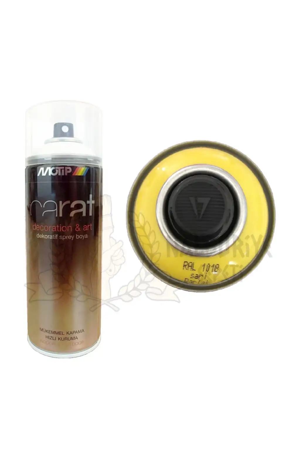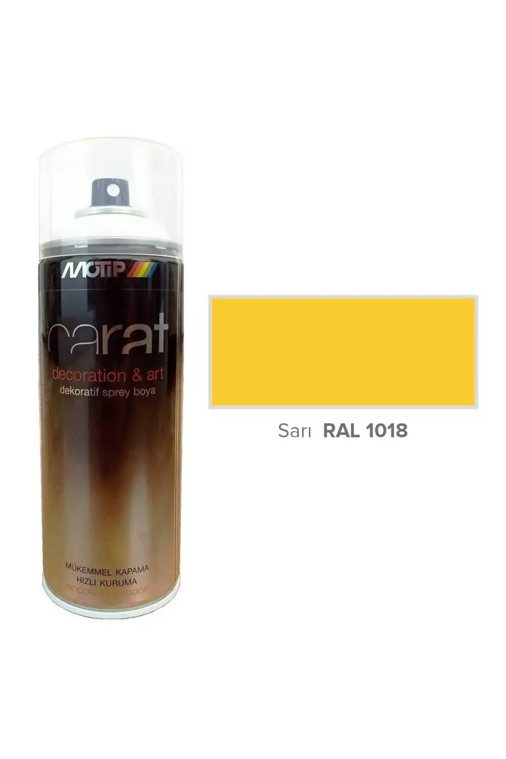 Sarı Ral 1018 400ml Sprey Boya Motip Carat sprey boyaları , hızlı kuruyan akrilik esaslı yüksek örtüçülüğe sahip ahşap, metal, tekstil, kağıt ve boyanabilir plastik yüzeylerde güvenle kullanabileceğiniz dekoratif sprey boyalardır. Çizilme ve ani darbelerin yanısıra değişik hava şartlarına karşı dayanıklıdır. Ayrıca sıva, beton ve taş yüzeylerde yapılacak işaretlemeler içinde uygundur. Ahşap, metal, beton, sıva v.b iç ve dış yüzeylere uygun, hızlı kuruyan, koruyucu bir film tabaka oluşturan, modifiye akrilik esaslı, solvent bazlı bir sprey boyadır. Mobilya ve eşya gençleştirme, beyaz eşya, genel onarım, hobi dekorasyon, bisiklet, motorsiklet ve otomotiv onarımlarında kullanılabilen mat veya parlak görünümünde, solmaya dirençli çeşitli dekoratif renk ve boya verniklerin yanısıra farklı ihtiyaçlara cevap verebilen muhtelif çeşitleri mevcuttur. Kurşunsuzdur. Ozon tabakasına zarar veren hiçbir madde içermez. UYGULAMA Tatbikatı öncesinde yüzeyin kir, pas, yağ, toz ve nemden arındırılması gerekir. PVC, fiver ve problemli metal yüzeylere özel binder veya uygun astar tatbik edilmesi gerekir. Kutu yaklaşık 1dk. süre ile çalkalandıktan sonra, 25-30 cm mesafeden ince katlar halinde, katlar arasında 20-25 dk. ara ile 2-3 çapraz katta tatbik edilir. Uygulama bittiğinde kutuda hala boya kalmışsa bu boyanın ileride tekrar kullanılabilmesi için, kutunun baş aşağı çevrilerek, püskürtme düğmesine bir kaç kez basılması gerekmektedir. KAPLAMA GÜCÜ Tek katta 2.5-3 m2 / 400ml kutu. KURUMA SÜRESİ(23 derece) Dokunma kuruması 5-20 dk. Tam kuruma 24 saat.