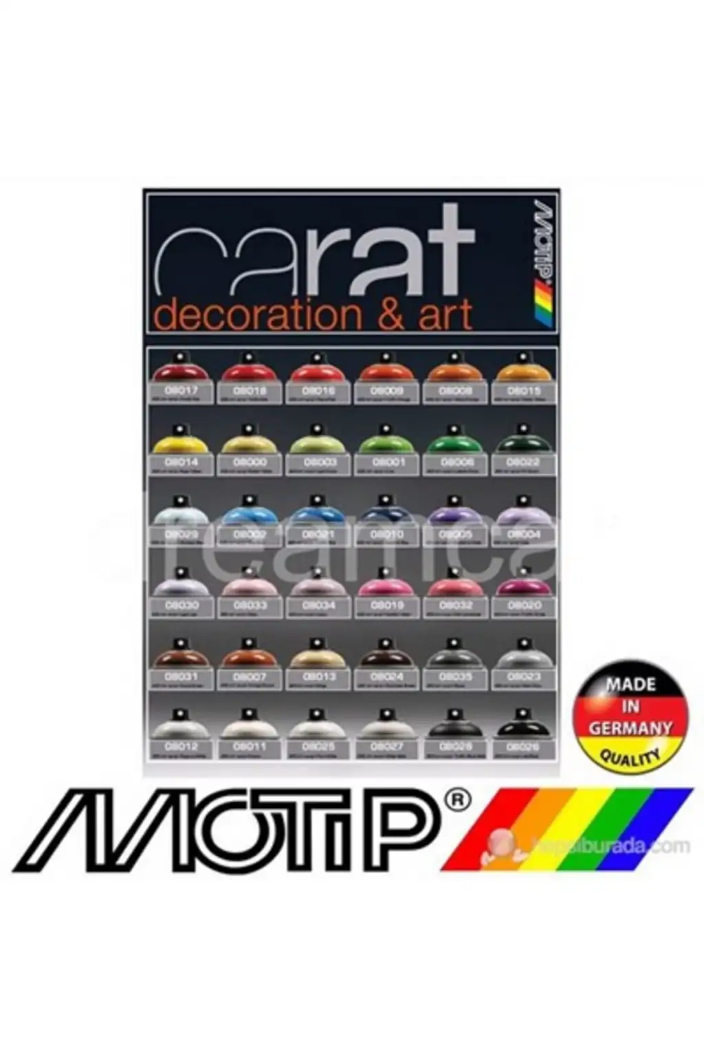 Motip Carat Ral 5002 Koyu Lacivert Parlak Akrilik Sprey Boya 400 Ml. Germany Motip Dupli GmgH/Almanya tarafından üretilmiştir. . Ral Kodu : Ral 5002 . İç ve dış mekan için. . Boya rengi kapaktaki renktir. . Boyanın rengi ve parlaklığı dayanıklıdır. . Çizilme ve ani darbelerin yanı sıra değişik hava şartlarına karşı da dayanıklıdır. . Ahşap, metal, kağıt, tekstil ve boyanabilir plastik yüzeylere uygulanabilir. . Ayrıca sıva, beton ve taş üzerine yapılacak işaretlemeler için uygundur. ÖZELLİKLER: . İç ve dış cephede kullanıma uygunluk . Günes ısığına ve hava kosullarına karsı dayanım . Renk ve parlaklığını koruma gücü . Çizilmelere karsı dayanım . Uzun süre dayanıklılık . Tüm renklerinde yüksek kapatıcılık gücü . Atmosferi kirletici CFC gazları bulunmamaktadır KURUMA: . Toz kuruma yaklasık 10 dakika . Dokunma kuruması yaklasık 15 dakika . Tamamen sert kuruma yaklasık 24 saat TÜKETİM: . 400 ml ile yüzeye bağlı olarak 0,8 - 1,5 m² AMBALAJ BOYUTU: . 400 ml boya içerir. UYGULAMA: . Alt yüzeyin temiz, kuru, passız ve yağsız olması gerekir. . Boyanmayacak yüzeylerin üzerini kapatarak koruyunuz. . Kullanmadan önce kutuyu 3 dk. çalkalayınız. . Uygulamadan önce deneme püskürtmesi yapınız. PARLAMA NOKTASI: 52 C UYARILAR: . Dikkat sağlığa zararlıdır. . Çocuklara satılamaz ve verilemez.