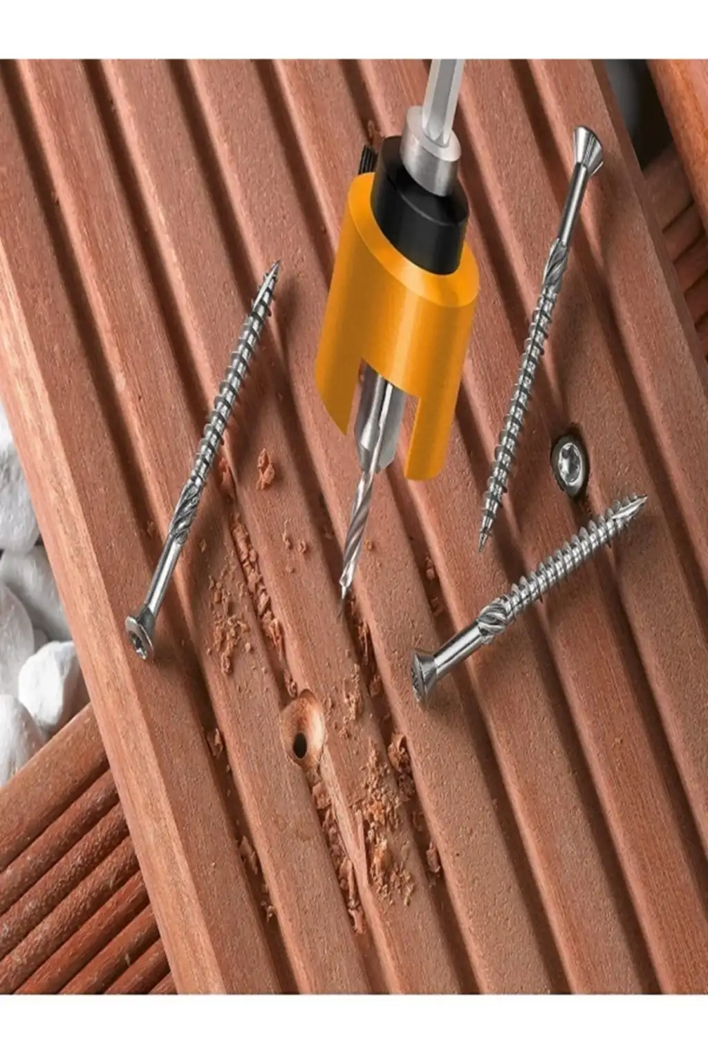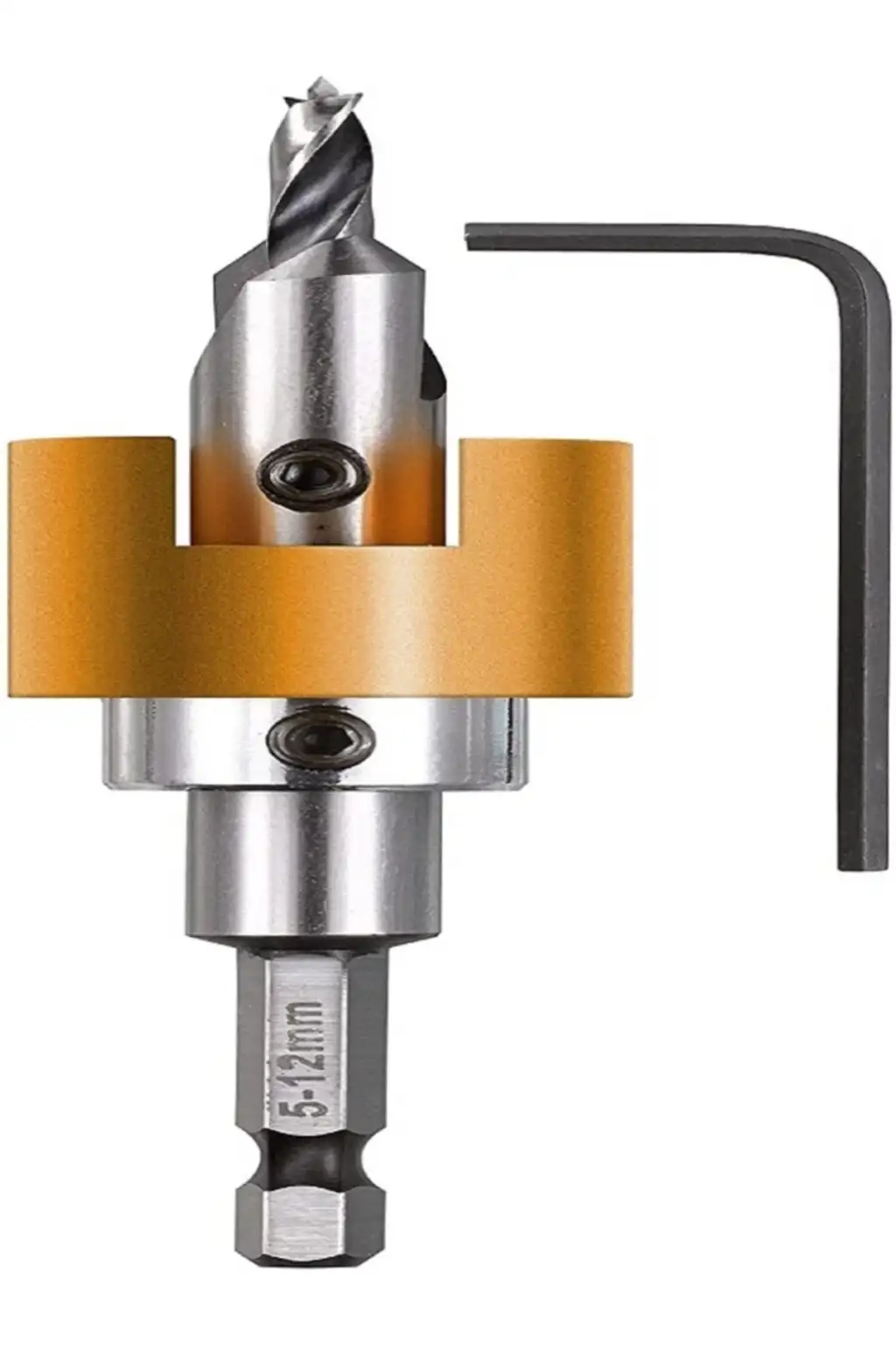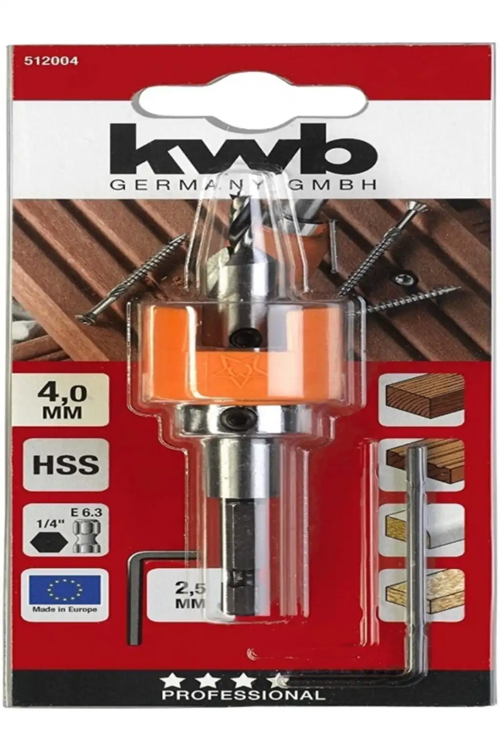 Sert ağaç matkap ucu, HSS-M2, ayarlanabilir derinlik stoplu ve havşa başlı, bilyalı yataklarda derinlik stoplu, vurulduğunda dönmez, ahşap yüzeylerde çizilmeyi önler, altıgen şaft 1/4" ISO 1173, E 6.3'e göre, Bangkirai için , sert ağaç, yumuşak ağaç, ön delme için ideal Sert ağaçlarda teras ve bahçe ahşabı döşenirken, her zaman eşit delme ve havşa derinliği.
