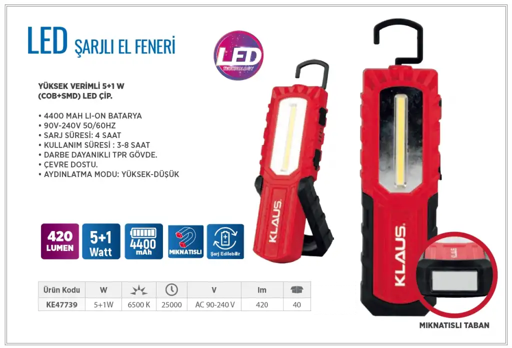 Klaus Şarjlı Led El Feneri 420 Lumen 4400 MAH 5+1 Watt