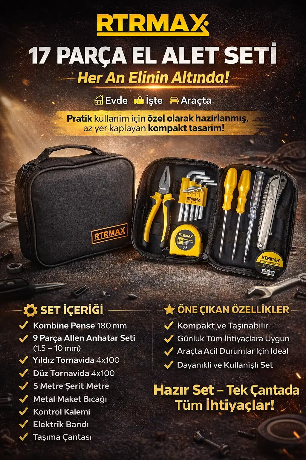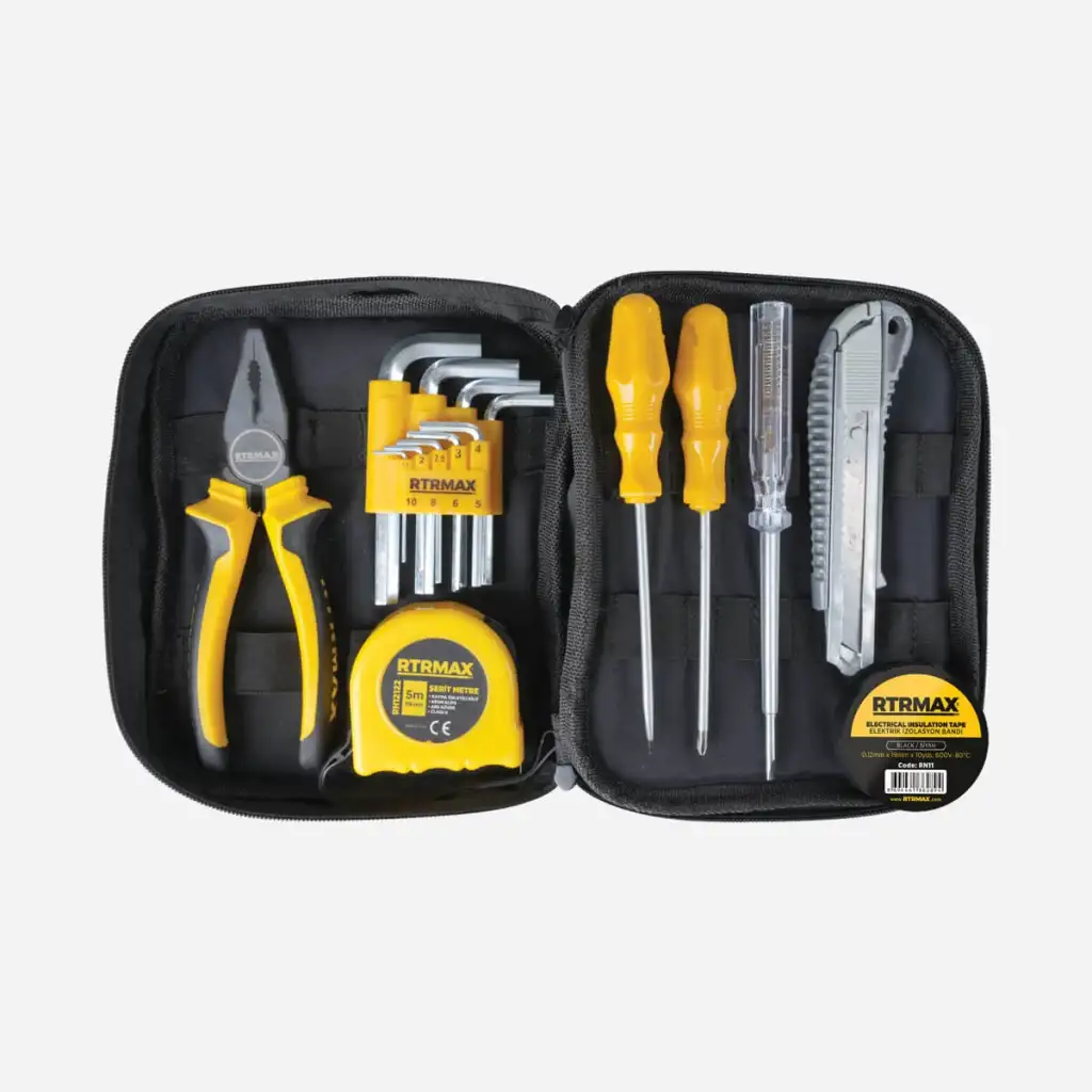 RTRMAX 17 Parça El Alet Seti, güncel araç kullanım ihtiyaçları göz önünde bulundurularak hazırlanmış, hem araçta hem evde hem de iş yerinde pratik çözümler sunan kompakt bir settir.
