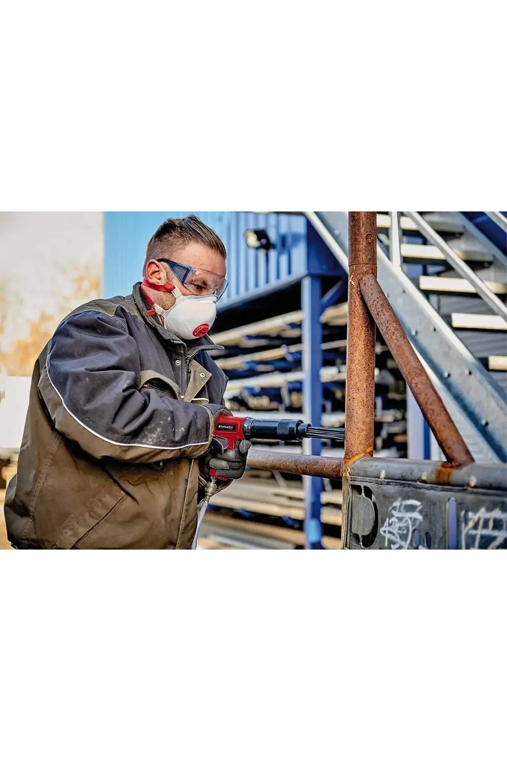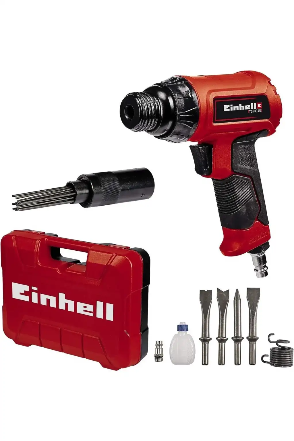 Maks. Çalışma basıncı: 6.3 bar;Hava tüketimi: 113 L/min;Üfleme oranı: 4500 min^-1;Freze derinliği: 43 mm;Darbe gücü: 1.2 J;Taş ve metal üzerinde çalışmak için yüksek performanslı keski;Kullanım sırasında güvenlik için kaymaz kauçuk tutamak;9 mm veya daha büyük hortum iç çapı ile en iyi performans;Uç, altıgen mandren tarafından güvenli bir şekilde tutulur;Çeşitli uygulamalar için 4 parçalı 120 mm keski seti dahil;Bir iğne ölçekleyici olarak kullanım için uygun ek parça dahil;Pas ve yüzeyleri temizlemek için iğne kazıyıcı;1 küçük yağ şişesi, 1 nipel ve 1 germe yayı dahil;Pratik bir taşıma ve saklama çantası dahil;Einhell pnömatik ( havalı ) kırıcı TC-PC 45, bir iğne kazıyıcı ile birlikte atölye, ev ve ev dışı alanlarda yenileme ve yıkım çalışmaları için güçlü bir yardımcıdır. Taş ve metal üzerinde çalışmak için uygun yüksek bir güce sahiptir. Kullanım sırasında güvenlik için kaymaz kauçuk tutamak mevcuttur. 6,3 bar maksimum çalışma basıncında cihaz, dakikada 4,500 darbe hızı ile 1,2 jul'e kadar darbe kuvveti sağlar. Uç, altıgen mandren tarafından güvenli bir şekilde tutulur. İç çapı 9 mm veya daha büyük olan bir hortum ile en iyi performans sağlanır. Kapsamlı donanım sayesinde, kullanıcı kullanım açısından pratikte sınır tanımaz. Teslimat içeriğine, 4 parçalı 120 mm keski seti, pas ve yüzeyleri temizlemek için iğne kazıyıcı, 1 küçük yağ şişesi, 1 nipel ve 1 germe yayı dahildir. Cihaz pratik taşıma ve saklama çantası içinde teslim edilir.