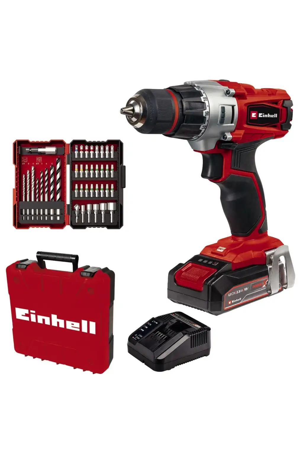 "Akü: 18 V | 2500 mAh | Li-İyon;Şarj süresi: 50 dakika;Dişli sayısı 2;Boşta çalışma hızı (1. vites): 0-350 dak^-1;Boşta çalışma hızı (1. vites): 0-1250 dak^-1;Maks. Tork hard: 44 Nm;Tork kademeleri: 21 ayar;Mandren: 10 mm | tek kollu;Akü Sayısı: 1 Adet;Power X-Change ailesinin bir üyesi;Güçlü vidalama ve hızlı delme için 2 vites;Otomatik 10 mm metal mandren;Mandren uç kilitleme özelliği;Tork kademeleri sayesinde vidalamada hassasiyet ayarı;Yumuşak tutamak, ergonomik tasarım;Çalışma alanını aydınlatmak için LED lamba ;Pratik kemer klipsi;1 x 2,5 Ah akü ve hızlı şarj cihazı içindedir;Pratik taşıma ve saklama çantası( E-Box Basic );39 parça bits ve matkap ucu setleriyle verilir;Einhell TE-CD 18/2 Li +39 (1x2.5 Ah) kömürsüz akülü vidalama makinesi, Power X-Change ailesi üyesidir. 13mm otomatik metal mandren sayesinde anahtarsız hızlı uç değişimi sayesinde yapılacak işlerde pratiklik sağlar. Güç gerektiren ağır vidalama işlerinizde 2 vites seçeneğiyle istediğiniz devir hızında kullanabilme imkanı sunar. Karanlık alanlarda vidalama veya delme işlemi yapacağınız alanı LED ışığıyla aydınlatması mevcuttur. Yumuşak tutamak özelliği ve ergonomik tasarımı sayesinde kullanıcı dostudur. Ürün ile birlikte 39 parça matkap ucu ve bits seti beraberinde bulunduğundan kullanıma hazır olarak gönderilir.